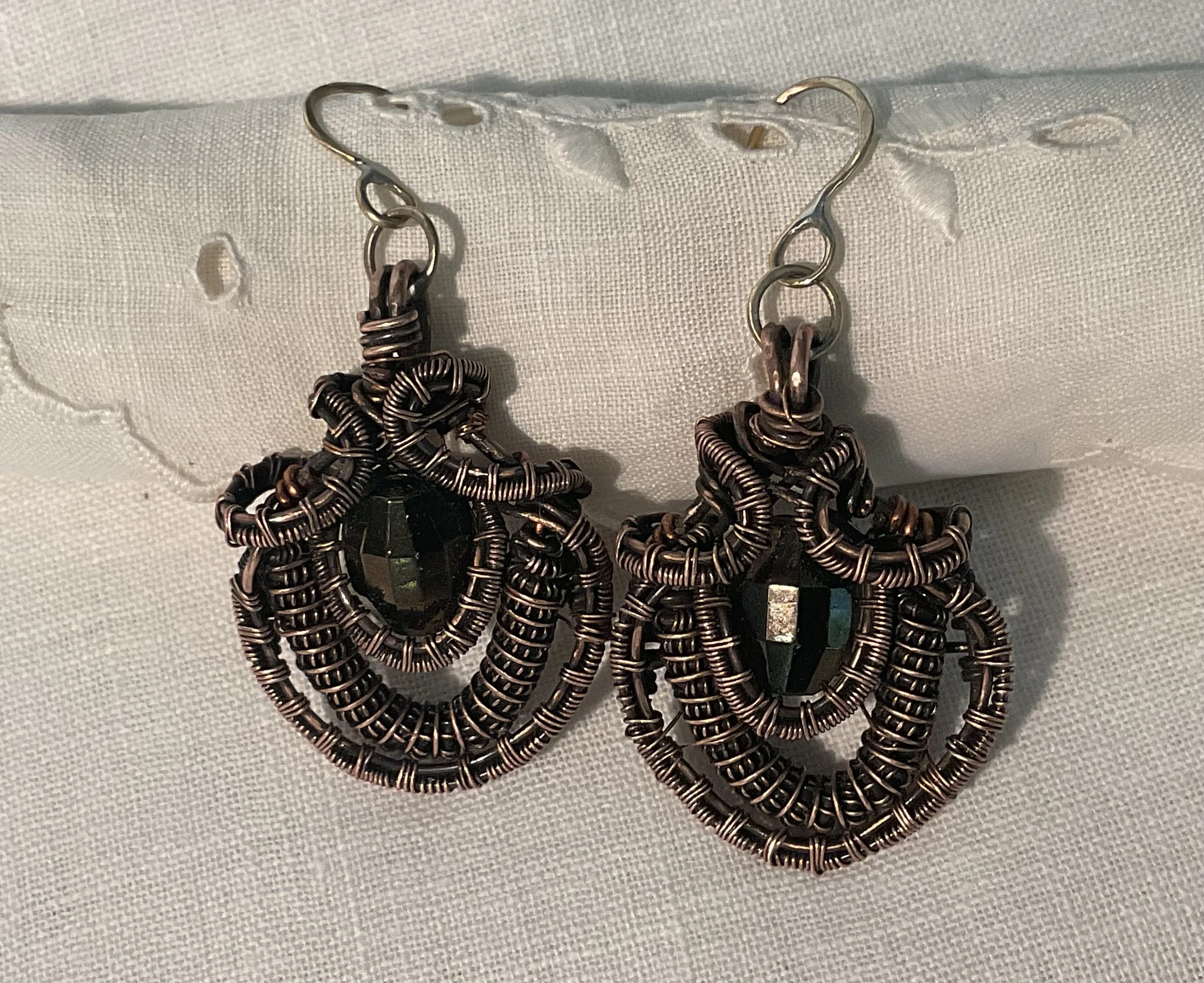 These lovely earrings are designed with intricate and interesting copper wire weaving showcasing pretty little vintage glass buttons.